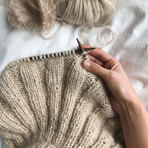 The Sunday Sweater is knit from the top down. The yoke is knit in the round with shaped with rib stitches and increases. Body and sleeves are knit in stockinette stitch and finished with a ribbed cuff. The sleeves on the Sunday Sweater are extra-long and widen before the cuff. The neckband is folded over and sewn to the inner side of the sweater.