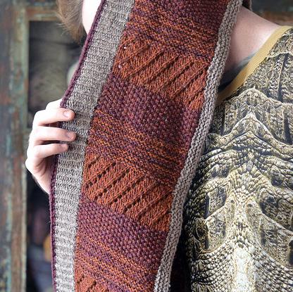 Fingering weight yarn is held double for a worsted gauge and marled fabric effect. The majority of the cowl is worked sideways with three colors in diagonal lace, corrugated ridges and seed stitch. The twisted rib and garter stitch edges are worked in the round with a fourth color.