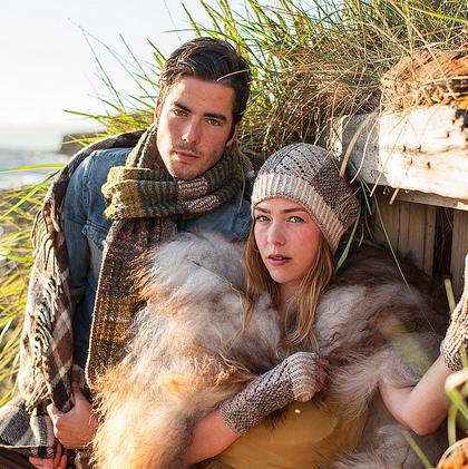 Fingering weight yarn is held double in three colors for a worsted gauge and marled fabric effect. The hat’s body is worked sideways in diagonal lace, corrugated ridges and seed stitch. The brim and crown shaping are worked in the round with twisted ribbing and garter stitch. Wear the hat pushed back with slouch or fold the brim for extra warmth on the ears.