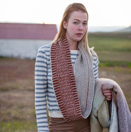 This double-sided cowl is worked in the round using three colors. One side features strong stranded columns and a geometric motif. After that section is finished, a purl ridge is worked followed by stockinette stitch stripes. The fabric is then folded in half, connecting the cast on edge as you bind off. The resulting reversible cowl is soft, graphic, and warm.